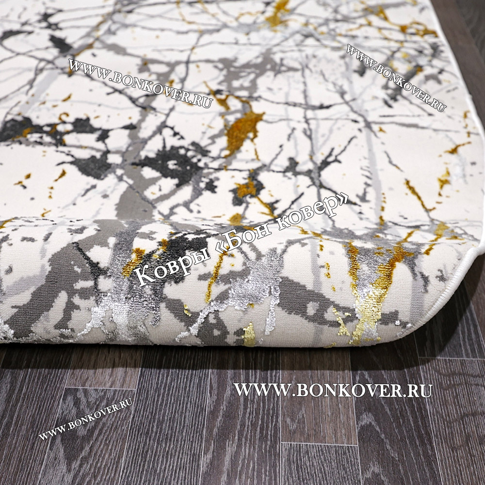Изящный Турецкий Абстрактный Ковер Белый с Золотистым Арт 30325 наполняет интерьер квартиры теплом и уютом, гармонично сочетает в себе изящество и стиль. Он соткан из высококачественного сырья, прочный и долговечный.